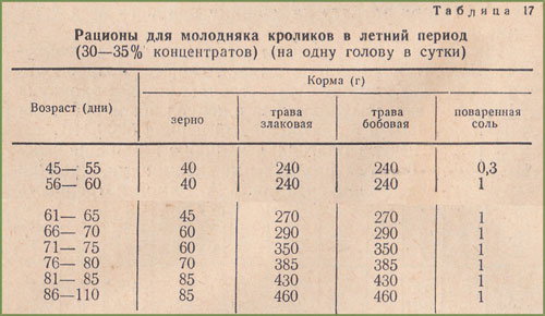Наилучшие результаты дали кролики, получавшие в суточном рационе в среднем 175 г корм ед. и 45% концентратов от общей питательности рациона. На таких рационах животные в возрасте 110 дней достигли веса 2,8—2,9 кг при затрате на единицу прироста веса 4,2 г корм ед. Для нормального развития и роста кроликов необходимо включать в рацион витаминные корма. Потребность кроликов в витамине А составляет для молодняка 850 ИЕ, для взрослых кроликов в период покоя 2700, для сукрольных 3850 и в лактационный период 5200 ИЕ. В летний период благодаря наличию в рационе зеленых кормов, богатых различными витаминами, кролики полностью обеспечены витамином А