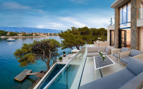 Эта вилла, расположенная на острове Брач, обладает массой достоинств и атрибутов роскошной жизни, но терраса – самая из них впечатляющая. Она двухуровневая и на нижнем уровне устроен большой бассейн с шикарным видом.